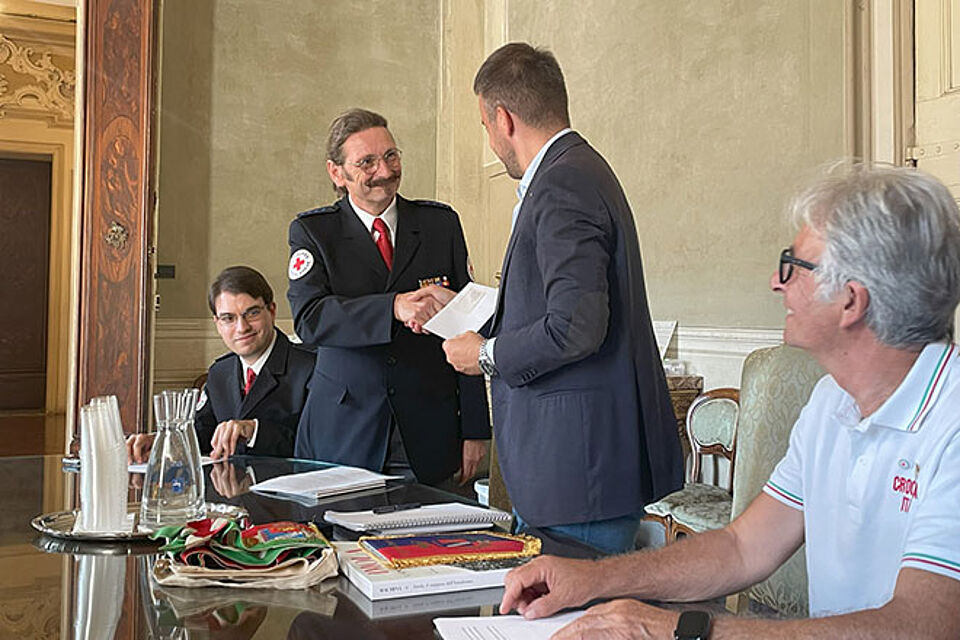 Der zweite Tag des Aufenthalts begann mit der Besichtigung des eindrucksvollen Palazzo Tozzoni. Im Anschluss daran fand als weiterer Höhepunkt ein offizieller Empfang bei Bürgermeister Marco Panieri im Rathaus statt. CRI-Präsident Brunori erläuterte in seiner Ansprache das Zustandekommen der Kooperation und unterstrich das herzliche Miteinander der Rotkreuzkameraden. Annalia Guglielmi, Präsidentin des Partnerschaftskomitees von Imola, gab ihrer Hoffnung Ausdruck, dass das Engagement des Roten Kreuzes Vorbildcharakter für andere Vereine aus Imola und Weinheim haben könnte. Large betonte in seinem Redebeitrag die universalen Werte der Rotkreuz- und Rothalbmondbewegung und die Bedeutung von Städtepartnerschaften für die Verständigung unter den Völkern Europas. Auch in seiner Funktion als Stadtrat überbrachte er Grüße aus Weinheim und überreichte Sindaco Panieri einen Brief von Oberbürgermeister Manuel Just. Dieser bedankte sich für das Schreiben und würdigte den Beitrag des Roten Kreuzes zur Weiterentwicklung der Städtepartnerschaft.
