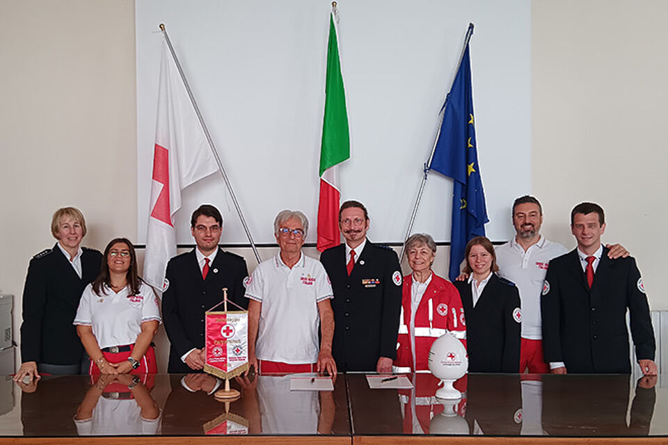 Im März des Jahres besuchte das Komitee des Croce Rossa Italiana in Imola auf Einladung des DRK-Ortsvereins Weinheim die Zweiburgenstadt, um erste Gespräche über eine Kooperation der beiden Rotkreuzgliederungen der Partnerstädte zu führen und sich persönlich kennenzulernen. Nun stand der Gegenbesuch von Mitgliedern des Weinheimer DRK-Vorstands unter Leitung des Vorsitzenden Prof. Dr. Rudolf Large an. Mit dabei waren Schatzmeister Volker Szallies, Bereitschaftsleiterin Stefanie Stiller und Jugendleiterin Maike Raitor, denn es sollten in den anstehenden gemeinsamen Tagen konkrete Aktionen der weiteren Zusammenarbeit auf Ebene der beiden Rotkreuzgemeinschaften geplant werden. Natürlich gehörte auch Vorstandsmitglied Luca Panizzo mit zur Weinheimer Delegation, der als in Weinheim lebender Italiener wesentliches Bindeglied und Motivator der Kooperation ist.