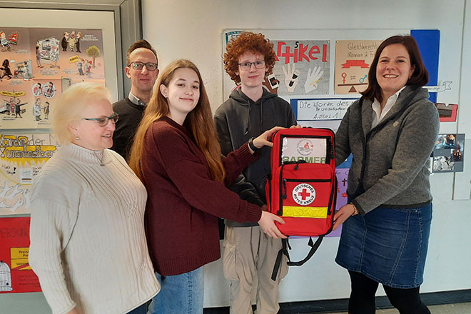 Die BARMER finanziert die Schulsanitätsrucksäcke, die jede teilnehmende Schule erhält. Darin befindet sich alles Notwendige für die Erste Hilfe: von den Handschuhen über Verbandszeug bis zur Rettungsdecke. Leider war Herr Sebastian Zeilfelder, der BARMER Mannheim verhindert, sodass Frau Kunz, Leitung des Fachbereichs Erste Hilfe und Mehr vom DRK-Kreisverband Mannheim aber dennoch den freudestrahlenden Schülern und der zuständigen Lehrerin Frau Paeth den Erste-Hilfe-Rucksack an den Schulsanitätsdienst am 16. Februar 2023 übergeben durfte.