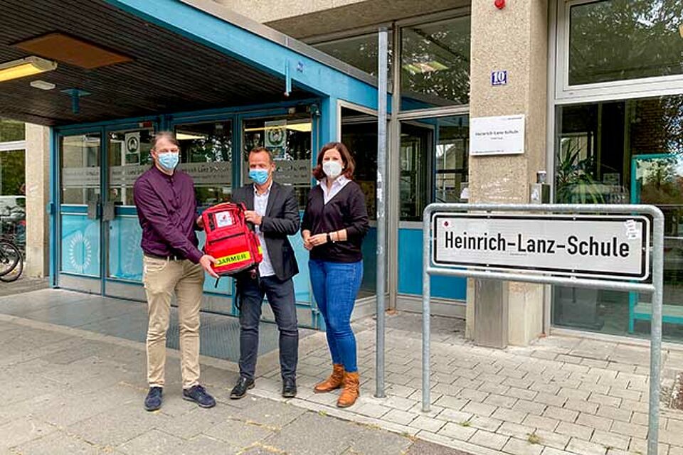 Die BARMER finanziert die Schulsanitätstaschen, die jede teilnehmende Schule erhält. Darin befindet sich alles Notwendige für die Erste Hilfe: von der Rettungsweste über Verbandszeug bis zur Rettungsdecke. Gemeinsam übergaben Sebastian Zeilfelder, Regionalge-schäftsführer der BARMER und Mareike Kunz, Fachbereichsleitung Erste Hilfe und Mehr vom DRK-Kreisverband Mannheim das ,,Starter Kit‘‘ an den SSD der beiden Schulen.